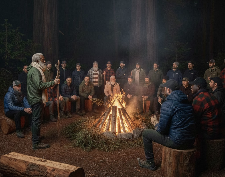 Attending FSB ‘07 were about eighty older men along with forty young men and boys from five to eighteen. It was amazing, delightful, even hopeful to see boys, young men, adult males, and elders together in the wilderness with no modern distractions: working, playing, eating, and learning together.