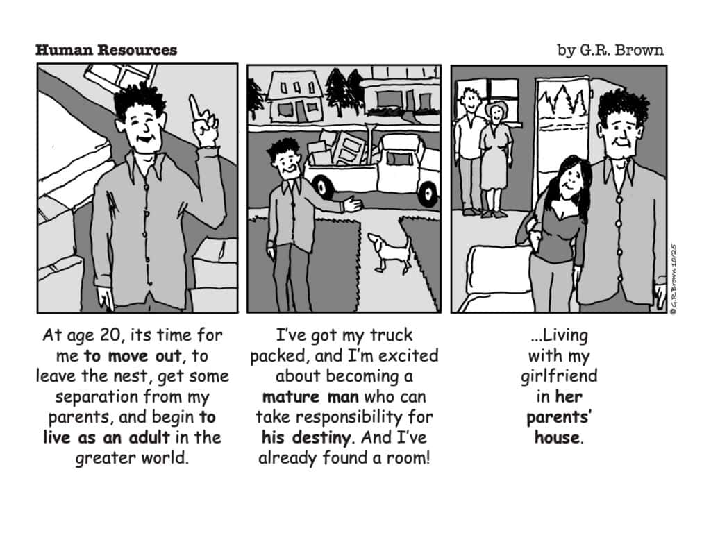 It may be a gut-wrenching separation; it may be a celebration. However it feels, leaving one’s home and family is the first concrete step in adulthood. The nets, or portions of them, have been removed. We’re suddenly on our own, and we have to deal with it, somehow.