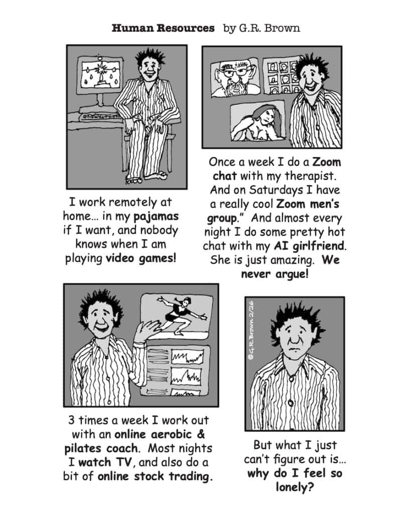 And now we feel an emptiness too, without him. Hence, this issue includes an Open Letter to Jim Ellis about the impact of his loss on a close friend. And it seems like a good time to explore what has become an epidemic of male isolation, and also some possible remedies. Several new writers have weighed in; our Burnsie in the House column explores the key distinction between aloneness and loneliness; MDI’s President has something to say about the International meeting last month, and our cartoonists have also been busy. But we’re not leaving it there. Here are some New Features to keep you company.