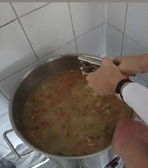 While the vegetables are being peeled, in an adjacent room, meat broth is being prepared. Nearly all Polish soups traditionally contain meat. So far the broth (soup base) is always based on pork or chicken. Beef and fish are too expensive. The chief cook and founder of the charity is a small,